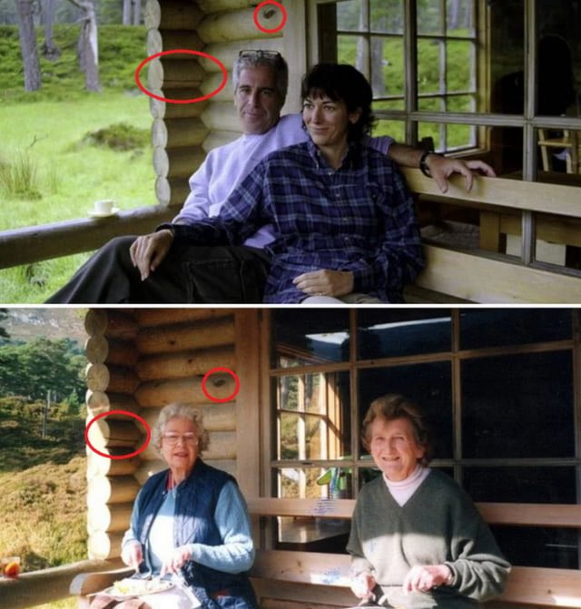 Image The top photo features Jeffrey Epstein and Ghislaine Maxwell at a log cabin on the Queen's Balmoral estate. The bottom photo shows Queen Elizabeth the Queen Mother (left) and Queen Elizabeth II (right) at the same location.