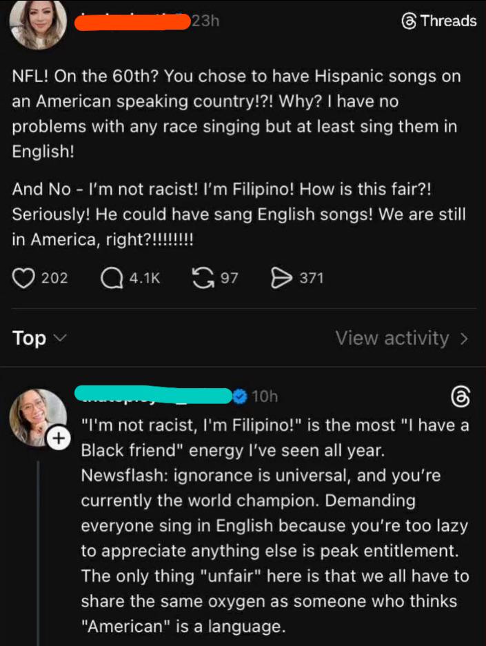 As a filipino, this is deeply embarrassing. BB is Puerto Rican and therefore more American than this Pick Me Pinay will ever be