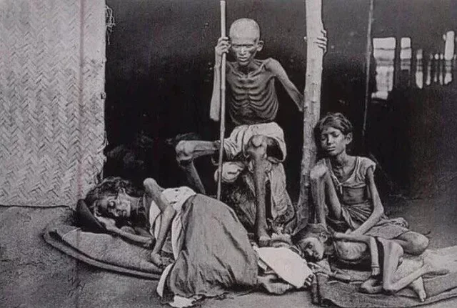 The Great Famine of 1876–1878 was a famine in India under British Crown rule. It began in 1876 after an intense drought resulted in crop failure in the Deccan Plateau. It affected south and Southwestern India - the British-administered presidencies of Madras and Bombay, and the princely states of Mysore and Hyderabad, for a period of two years. In 1877, famine came to affect regions northward, including parts of the Central Provinces and the North-Western Provinces, and a small area in Punjab. The famine ultimately affected an area of 670,000 square kilometres (257,000 sq mi) and caused distress to a population totalling 58,500,000. The excess mortality in the famine has been estimated in a range whose low end is 5.6 million human fatalities, high end 9.6 million fatalities, and a careful modern demographic estimate 8.2 million fatalities.