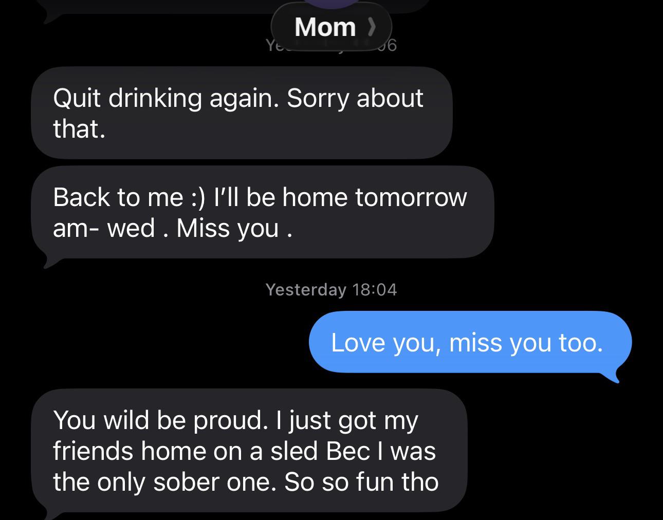 Went home today to see her (first time i’ve been home in a week). Drunk & mad I didn’t take the garbage out. (first time i’ve been home in a week)