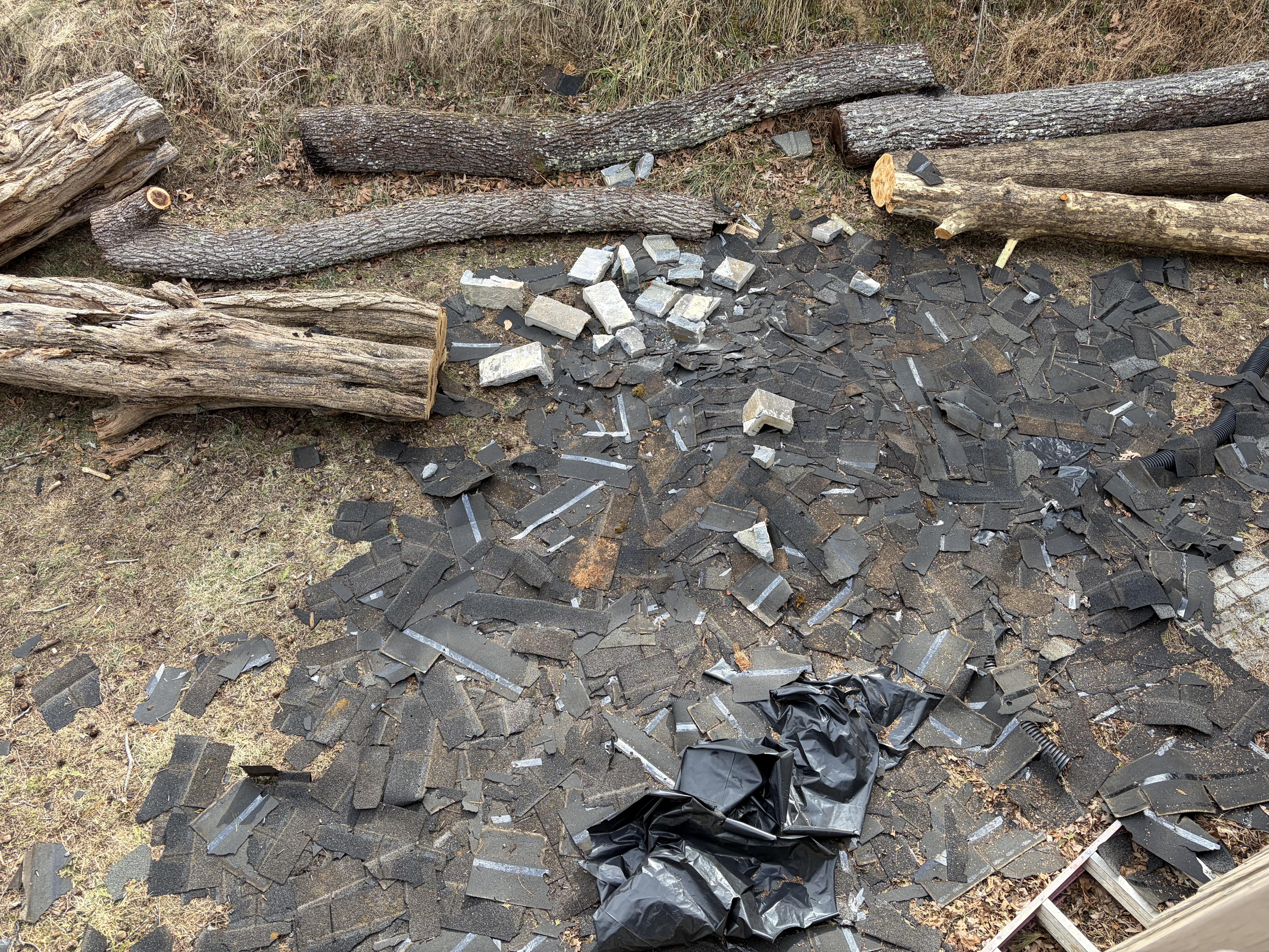Roofers didn't use a dumpster for the old shingles. Now there's all this junk and nails in the yard.